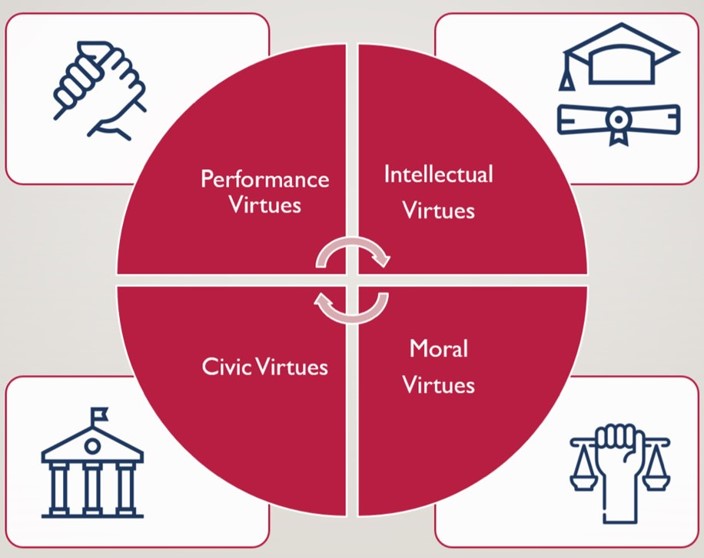 - Civic virtues – virtues that ensure we are engaged in responsible citizenship. We contribute to the common good for the wider community and society around us. Essentially, we are culturally aware and benefit the wider world we inhabit.